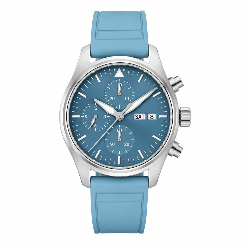 Stainless Steel Men’s Automatic Chronograph Watch, Sky Blue Pilot Style Dial, Day-Date Display, Rubber Strap, Sports Wristwatch